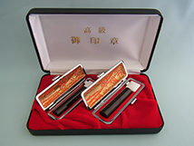 黒い印材で、硬度・弾力性ともすぐれ、オランダ水牛同様に角の芯の部分を印材として使用します。黒地に印面の朱が映えるため、昔から印鑑らしく価格的にも安価で最も人気な印材です。